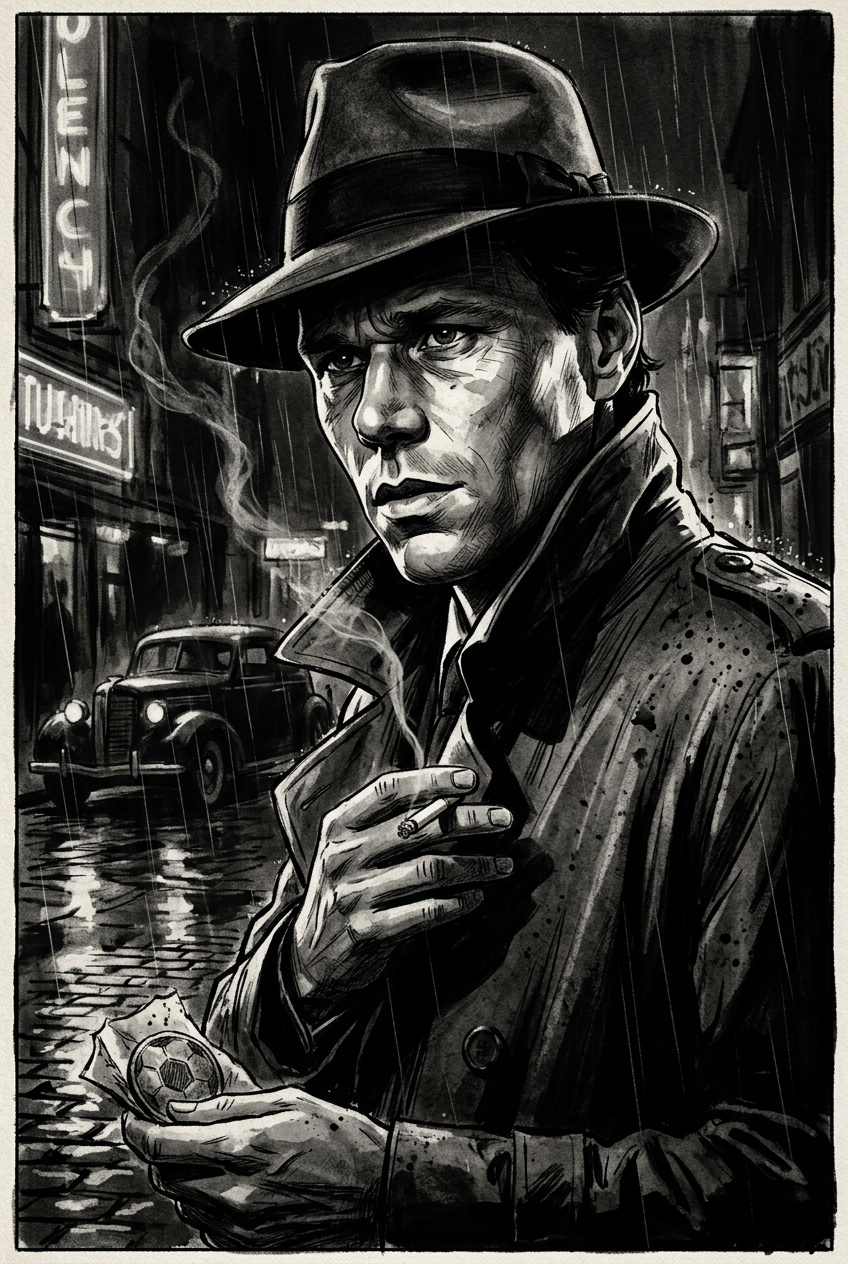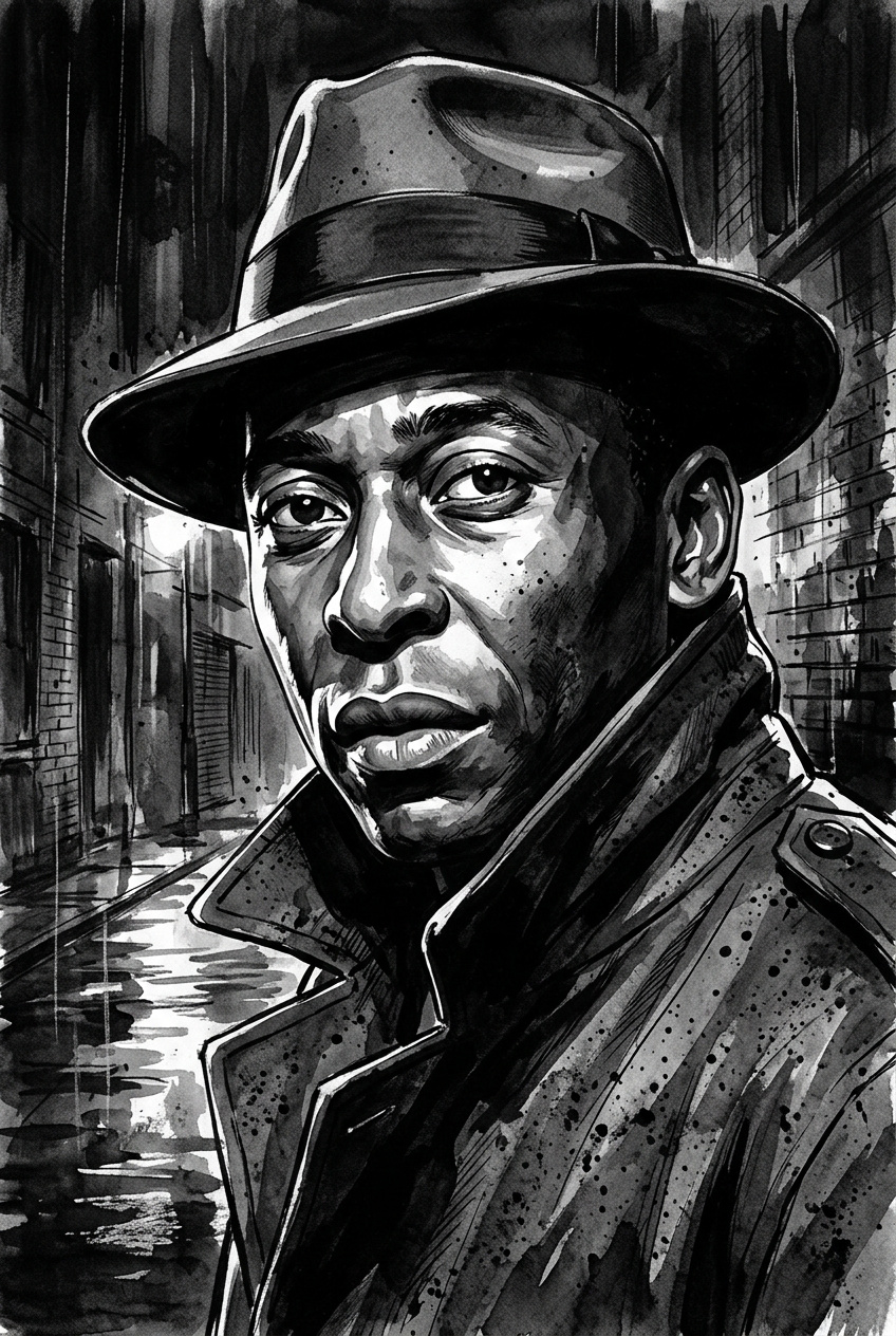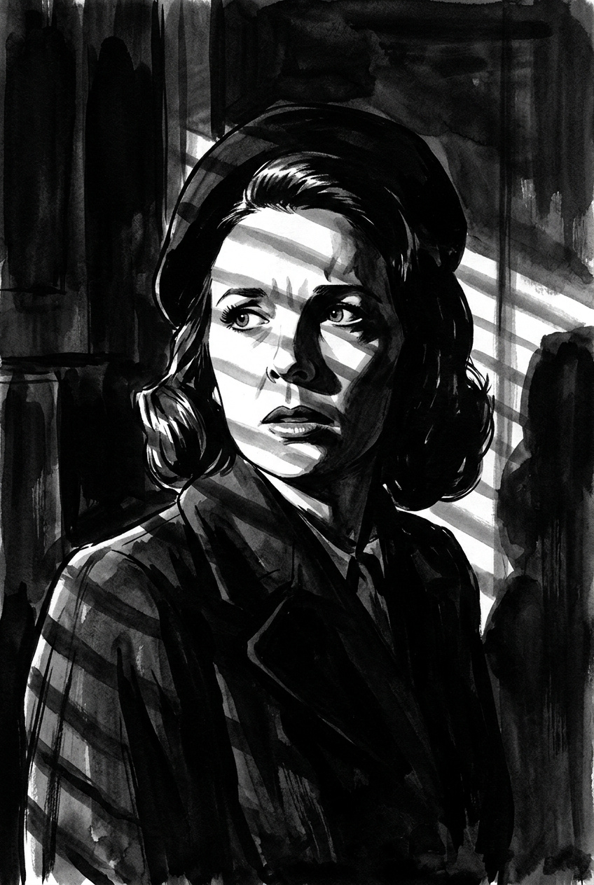 Dramatic Film Noir illustrations in black and white with deep shadows.